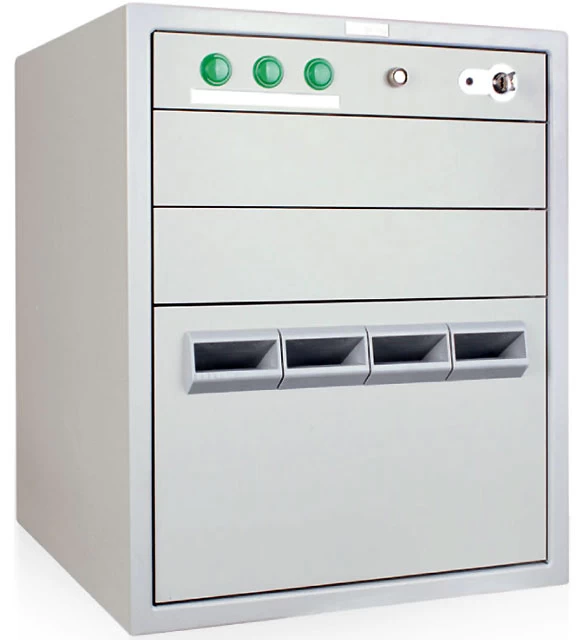 Нижний ящик отделен от верхних ящиков специальной пластиной, что исключает возможность доступа к депонируемым банкнотам при открытом верхнем ящике